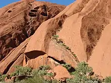 During heavy rain, waterfalls cascade down the sides of Uluru, a rare phenomenon that only 1% of all tourists get to see.[39] Large rainfall events occurred in 2016[40] and the summer of 2020–21.[41][42][43][44]
