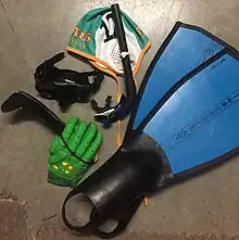 1. snorkel and mouth guard 2. hat with ear guards 3. mask 4. fins 5. stick 6. puck 7. glove