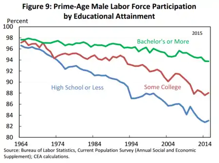 The line chart shows the long-term decline in labor force participation for males of prime-working age (25–54 years), based on educational attainment.[84]