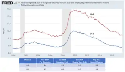 • The unemployment rate (U-6) is a wider measure of unemployment, which treats additional workers as unemployed (e.g., those employed part-time for economic reasons and certain "marginally attached" workers outside the labor force, who have looked for a job within the last year, but not within the last 4 weeks). The U-6 rate rose from 8.8% in December 2007 to a peak of 17.1% in November 2009, before steadily falling to 9.2% in December 2016 and 7.6% in December 2018.[42]