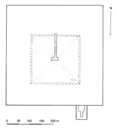 The alignment of the pyramid complex is very similar to that of the pyramid of Djedefre. It consisted of a 465 m × 420 m (1,526 ft × 1,378 ft) enclosure wall within which the mortuary temple should have been located. However, since the first layer of the pyramid was never even started, the surrounding complex was also left unfinished and there are no traces of a mortuary temple, a causeway, a valley temple or any other cultic building.[1][5][6]