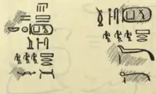 The main problem is the correct reading of the cartouche name found within at least six ink inscriptions. Whilst the lower and therefore second hieroglyphic sign is certainly a Ka-symbol, the first sign is illegible. Unfortunately the excavator, Alessandro Barsanti made no facsimiles of the inscriptions and made rather slipshod hand-drawings instead, so that the first hieroglyph remains indecipherable.[7] As a consequence there are several alternative readings of the cartouche name: Kurt Sethe reads Nebka ("His Ka is the lord"), Jean-Philippe Lauer reads Bik-Ka ("his Ka is divine"), Peter Kaplony reads Schena-Ka ("his Ka is forceful") and Gaston Maspero reads Nefer-Ka ("his Ka is beautiful/flawless").[8][9][10] Wolfhart Westendorf even proposes the depiction of a giraffe, an animal that was seen as wise and bedizen with shamanistic powers.[11]