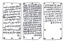 Three gold plaques were excavated from the site in 1964, two written in Etruscan, and one in Phoenecian. The two longer Etruscan and Phoenecian inscriptions clarify the dedication of the temple was to unialastres as the genitive form of uni-astre, an amalgamated goddess of the Etruscan Uni as uni and Phoenecian Astarte as astre.[15] The dedication came from the ruler of Caere, in gratitude for her support of his reign.[16] The shorter of the Etruscan inscriptions outlines distinct annual rituals which took place to ensure the ongoing purity of the temple.[16]