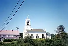 The early history of the church is shrouded in mystery; it was dedicated in January 1841, and its designer and builder are not known. The bell in the tower is original, and the clock was added in 1889. Use of the building for religious purposes had declined by the early 20th century to the point that it was deeded to the town, apparently with the stipulation that its exterior remain unaltered. It served as the community's town hall until 1987, and was further adapted for use as a gymnasium by the local schools in 1949-50. These functions were moved to a modern facility in 1987. The building has since housed the town library and archives.[3]