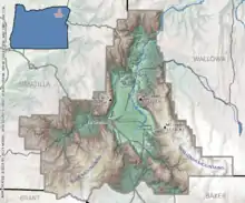 According to Oregon Geographic Names, the county is named for the town of Union. Union County was originally part of Baker County (which was originally a part of Wasco County, which was originally part of Clackamas County). The northern end of the Grande Ronde Valley was the first part to be settled.[3] During the 1860s, population growth in eastern Oregon prompted the State Legislature to split Umatilla and Baker Counties from Wasco County in 1862. Further settlement in the Grande Ronde Valley led to the division of Baker County to create Union County on October 14, 1864. The county doubled in population between 1880 and 1890.[3]