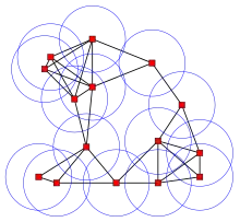 Beginning with the work of Huson & Sen (1995), unit disk graphs have been used in computer science to model the topology of ad hoc wireless communication networks. In this application, nodes are connected through a direct wireless connection without a base station. It is assumed that all nodes are homogeneous and equipped with omnidirectional antennas. Node locations are modelled as Euclidean points, and the area within which a signal from one node can be received by another node is modelled as a circle. If all nodes have transmitters of equal power, these circles are all equal. Random geometric graphs, formed as unit disk graphs with randomly generated disk centres, have also been used as a model of percolation and various other phenomena.[5]