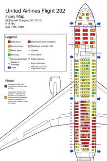 United Airlines Flight 232 was a regularly scheduled United Airlines flight from Stapleton International Airport in Denver to O'Hare International Airport in Chicago, continuing to Philadelphia International Airport. On July 19, 1989, the DC-10 (registered as N1819U) serving the flight crash-landed at Sioux Gateway Airport in Sioux City, Iowa, after suffering a catastrophic failure of its tail-mounted engine due to an unnoticed manufacturing defect in the engine's fan disk, which resulted in the loss of many flight controls. Of the 296 passengers and crew on board, 112 died during the accident,[lower-alpha 1] while 184 people survived. 13 of the passengers were uninjured. It was the deadliest single-aircraft accident in the history of United Airlines.[3][4]