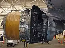 The National Transportation Safety Board (NTSB) is investigating the incident.[9] An NTSB structures engineer and two investigators from the NTSB's Denver office collected fallen debris with local law enforcement and safety agencies over several days immediately after the incident. Most of the structure from the inlet cowl and fan cowl doors that separated from the aircraft was recovered and identified. Recovered portions of the inlet cowl, fan cowl door structure, and inlet cowl attach ring were laid out in a hangar (pictured). The inlet cowl, fan cowl doors, and thrust reversers will be examined further by NTSB investigators to map damage and cowl failure patterns after the fan blade failure, and to examine the subsequent progression of fire in the thrust reversers.[25]