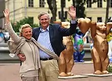 Buddy Bears are painted, life-size fiberglass bear sculptures developed by German businesspeople Klaus and Eva Herlitz, in cooperation with sculptor Roman Strobl. They have become a landmark of Berlin and are considered unofficial ambassadors of Germany. The outstretched arms of the standing Buddy Bear symbolise friendliness and optimism.[1] The first bears were displayed at an artistic event in Berlin in 2001.[2]