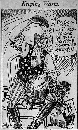 • United Mine Workers coal strike of 1919 – November 1, 1919. Some 400,000 members of the United Mine Workers went on strike on November 1, 1919, although Attorney General A. Mitchell Palmer had invoked the Lever Act, a wartime measure criminalizing interference with the production or transportation of necessities, and obtained an injunction against the strike on October 31.[16][17] The coal operators smeared the strikers with charges that Russian communist leaders Lenin and Trotsky had ordered the strike and were financing it, and some of the press repeated those claims.[18]