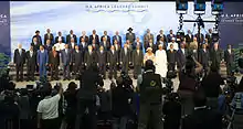 Africa consists of 54 sovereign states; in 2014, all of them, with the exception of Morocco, were members of the African Union. Invitations were extended to fifty African leaders who are "in good standing" with both the US and the African Union.[33] Nkosazana Dlamini-Zuma, the Chairperson of the African Union Commission was also invited.[34][35] President Obama met the leaders "as a group", and not on an individual basis.[36][37] Of the fifty leaders, thirty-seven were Heads of State.[38]