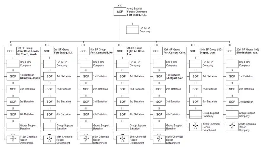 In 1957 the two original special forces groups (10th and 77th) were joined by the 1st SFG, stationed in the Far East. Additional groups were formed in 1961 and 1962 after President John F. Kennedy visited the Special Forces at Fort Bragg in 1961.[38] The 5th SFG was activated on 21 September 1961; the 8th SFG on 1 April 1963; the 6th SFG on 1 May 1963; and the 3rd SFG on 5 December 1963.[39] In addition, there have been seven Reserve groups (2nd SFG, 9th SFG, 11th SFG, 12th SFG, 13th SFG, 17th SFG, and 24th SFG) and four National Guard groups (16th SFG, 19th SFG, 20th SFG, and 21st SFG). A 4th SFG, 14th SFG, 15th SFG, 18th SFG, 22nd SFG, and 23rd SFG were in existence at some point.[40] Many of these groups were not fully staffed and most were deactivated around 1966.[48]