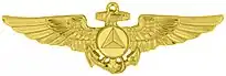 The NOAA Commissioned Officer Corps Aviator Insignia is a gold-colored pin, winged, with a central device consisting of a fouled anchor surcharged with a NOAA Corps device. NOAA Corps officer pilots and navigators may wear the NOAA aviator insignia after authorization by the Director of the NOAA Corps.