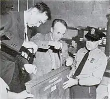 The first wave of gold shipments was made semi-weekly between January 11 and June 17, 1937, and overseen by the United States Post Office Department.[7][8] The gold was transported from the New York Assay Office and the Philadelphia Mint onto trains using postal trucks and municipal police escorts.[8] In the armored train cars, postal workers were accompanied by soldiers, secret service agents, and mint guards.[7][9] Decoy trains were employed.[8] The gold was transferred from trains onto Army trucks under the protection of soldiers armed with armor-piercing bullets and machine guns. The trucks were escorted by combat cars of the 1st U.S. Cavalry Regiment to the depository.[10] The Post Office Department billed the Treasury Department for transporting the weight of the crates and gold using the fourth-class postage rate with added insurance fees.[7]