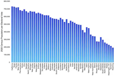 The merits of the electoral college system is a matter of ongoing debate in the United States, which came closest to switching to direct voting for president in 1969–70.[1] Supporters argue that it requires presidential candidates to have broad appeal across the country to win, while critics argue that it is not representative of the popular will of the nation.[lower-alpha 1] Winner-take-all systems, especially with representation not proportional to population, does not align with the principle of "one person, one vote".[lower-alpha 2][5] Critics object to the inequity that due to the distribution of electors, individual citizens in states with smaller populations have more voting power than those in larger states.[6] This is because the number of electors each state appoints is equal to the size of its congressional delegation, each state is entitled to at least 3 regardless of its population, and the apportionment of the statutorily fixed number of the rest is only roughly proportional. This allocation has contributed to runners-up of the nationwide popular vote being elected president in 1824, 1876, 1888, 2000, and 2016.[7][8] In addition, faithless electors may not vote in accord with their pledge.[9][lower-alpha 3] Further objection is that candidates focus their campaigns on swing states.[11]