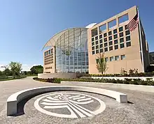 In March 2011, USIP moved into its permanent headquarters facility at the northwest corner of the National Mall in Washington, D.C. Designed by Moshe Safdie Architects and Buro Happold, the LEED-certified building aims to serve as a symbol of America's commitment to peacebuilding. The building houses offices and staff support facilities, a library, a conference center, auditorium, classrooms, and a public education center.[36] Officials broke ground for the new headquarters in June 2008 at a ceremony that included President George W. Bush, Senate majority leader Harry Reid, and Speaker of the House Nancy Pelosi.[37]