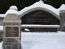 West Point's Cadet Honor Code reads simply that: "A cadet will not lie, cheat, steal, or tolerate those who do."[168] Cadets accused of violating the Honor Code face an investigative and hearing process. If they are found guilty by a jury of their peers, they face severe consequences ranging from being "turned back" (repeating an academic year) to separation from the academy.[169] Cadets previously enforced collective censure by an unofficial sanction known as "silencing" by not speaking to cadets accused of violating the honor code, but the practice ended in 1973 after national scrutiny.[170][171]