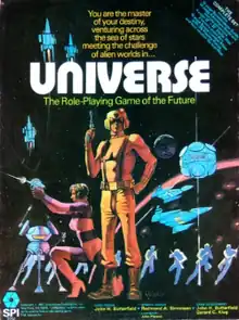 Universe: The Role-Playing Game of the Future is a science fiction role-playing game published by Simulation Publications, Inc (SPI) from 1981 to 1983. It was praised[1][2][3][4] for its innovative and tightly organized rules for such sci-fi RPG concerns as generating planets, applying character skills to in-game situations, and resolving the initial moments of alien encounters; however, it was also criticized for its cumbersome encounter/combat system and its lack of compelling background material. Universe was also noted for its "striking"[1] Interstellar Display, a poster-sized, astronomically accurate map of all stars within 30 light-years of Earth.