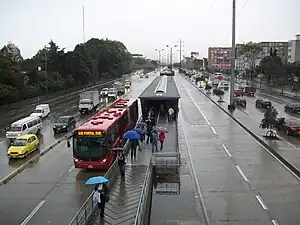 The simple-station Universidad Nacional de Colombia is part of the TransMilenio mass-transit system of Bogotá, Colombia, opened in the year 2000.