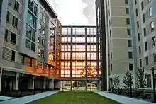 The Residential District is in the southern portion of the campus, along Wheeler Avenue and east of Martin Luther King Boulevard. This area has undergraduate dormitories, the Conrad N. Hilton College of Hotel and Restaurant Management, now Conrad N. Hilton College of Global Hospitality Leadership, and the College of Optometry. Dormitory facilities include the twin 18-story Moody Towers, Cougar Village, University Lofts, Cougar Place, and the recently demolished Quadrangle which had the following five separate halls: Oberholtzer, Bates, Taub, Settegast, and Law. The Quadrangle was rebuilt in 2020 and renamed The Quad, admitting sophomore level students and up. Adjacent to the Moody Towers and Lynn Eusan Park is the Hilton University of Houston Hotel.