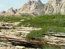 Systematic joints are planar, parallel, joints that can be traced for some distance, and occur at regularly, evenly spaced distances on the order centimeters, meters, tens of meters, or even hundreds of meters. As a result, they occur as families of joints that form recognizable joint sets. Typically, exposures or outcrops within a given area or region of study contains two or more sets of systematic joints, each with its own distinctive properties such as orientation and spacing, that intersect to form well-defined joint systems.[2][4]