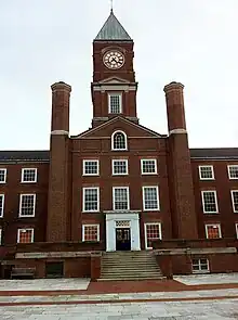 The main structure (the Upper School), constructed between 1959 and 1960, central on the campus, and with a dominant clock tower, houses the secondary school component of the college, in a quadrangle form. Laidlaw Hall, the principal assembly hall, featuring a full theatre stage and a pipe organ, is attached to the west end of the Upper School and, at the other end, is the Memorial Wing, the school's main infirmary.[60] Closing the north end of the main quadrangle (which is the location of the statue of the Lord Seaton, installed in 1934[61]) is one building, built in 1932, that contains the two boarding houses, as well as two private residences for the associated boarding masters,[41] adjacent to which is the school chapel, donated by Governor General Vincent Massey.[62]