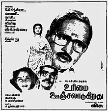 Urimai Oonjaladugiradhu (transl. Rights are swinging) is a 1992 Indian Tamil-language drama film written and directed by Visu. He stars, alongside Major Sundarrajan, Kishmoo, Ramesh Aravind, Kasthuri, Sangeetha and Vadivukkarasi. The film was released on 14 August 1992, and failed commercially.