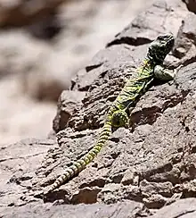 Uromastyx ornata can reach a total length of about 35 cm (14 inches).[6] These medium-sized lizards are among the most colorful members of the genus. Body color is rather variable, but basically greenish, with a series of yellowish annuli. They have a significantly long, very spiny and slightly flattened tail, formed by 20-23 segments. On the anterior margin of the ear opening there are a few enlarged scales.[3] On the upper side of the thighs small spines are present.