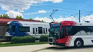 Bus and TRAX train at the 2700 West Sugar Factory Road station