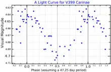 V399 Carinae has long been suspected to be variable.[18] A 1981 study of yellow supergiants fit observations to a Cepheid-like light curve with a period of 58.8 days, although the luminosity and spectral type do not place the star near the Cepheid instability strip.[15] It was listed in the General Catalogue of Variable Stars as a possible δ Cep variable.[19] Further observations refined the period to 47.25 days.[6] The Hipparcos catalogue classified V399 Car as a semiregular variable with a period of 88 days and a mean amplitude of only 0.04 magnitudes.[20] An automated classification from Hipparos photometry suggested it is an α Cygni variable.[21] The observed brightness varies from magnitude +4.63 to +4.72.[2]