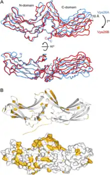 Vps26 is a 38-kDa subunit that has a two-lobed structure with a polar core that resembles the arrestin family of trafficking adaptor.[8][9] This fold consist of two related β-sandwich subdomains with a fibronectin type III domain topology. The two domains are joined together by a flexible linker and are closely associated by an unusual polar core. Arrestins are regulatory proteins known for connecting G-protein coupled receptors (GPCRs) to clathrin during endocytosis. They play many critical roles in cell signalling and membrane trafficking.[10] Both Vps26 and arrestins are composed of two structurally related β-sheet domains forming extensive interfaces with each other, using polar and electrostatic contacts to create interdomain interactions for ligand binding. However, there are significant structural differences between both Vps26 and arrestins. Vps26 protein has extended C-terminal tails that do not contain identifiable clathrin- or AP2-binding sequences, and therefore cannot form stable intramolecular contacts with clathrin and AP2, which has been observed for arrestins. Moreover, Vps26 does not have similar sequences as arrestins for GPCR and phospholipid interactions.[11]