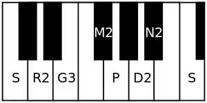 - ārohaṇa: S R₂ G₃ M₂ P D₂ N₂ Ṡ[lower-alpha 1]