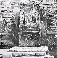 ![]() The Vajrasana was encased under a massive statue of the Buddha (back frieze, quite damaged, with pigeons visible) ![]() Discovery of the Vajrasana |