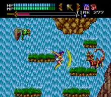 Like its predecessors, Valis III is an action-platform game starring Yuko Asou, wielder of the mystical Valis sword, and is set after the events of Valis II.[1][2] Together with her two allies, Valna and Cham, Yuko must prevent the Dark World's king, Glames, who is wielding the sword Leethus, from destroying Vecanti and Earth, .[3][4][5] The player controls Yuko through two-dimensional levels, battling enemies, jumping from ledge to ledge, and running until the player faces a boss at the end of each level.[5] At certain points in the game, gameplay pauses, and a cinematic cutscene plays regarding the game's storyline.[4]