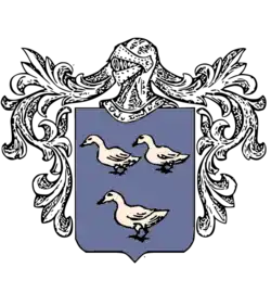 Van den Eynde is the name of an old Netherlandish noble family. One of the earliest recorded Van den Eynde to use the three-duck canting arms was Jacob van den Eynde, first Councilor and pensionary of Delft, and the highest[1][2] official in the county of Holland. The Van den Eynde became especially prominent in 16th-century Delft, 17th-century Antwerp (from whence the surname likely originates) and Naples.