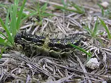 Larvae go through five growth stages (called instars). For about 10 days they have a brown body with small white spots and fine hairs (setae). At about 2.5 mm they moult and during this stage develop a pale stripe along the body just above the legs. The setae start to develop spikes, usually two or more at this stage. At about 5 mm long they moult again and the pale longitudinal lines become more obvious. At about 10 mm they moult once more, and the setae develop more spikes.[2] The last moult is at about 22 mm, from where caterpillars grow to about 36 mm before pupating into a roughly 20–mm pupa.[1]