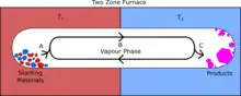 In chemistry, a chemical transport reaction describes a process for purification and crystallization of non-volatile solids.[1] The process is also responsible for certain aspects of mineral growth from the effluent of volcanoes. The technique is distinct from chemical vapor deposition, which usually entails decomposition of molecular precursors (e.g. SiH4 → Si + 2 H2) and which gives conformal coatings. The technique, which was popularized by Harald Schäfer,[2] entails the reversible conversion of nonvolatile elements and chemical compounds into volatile derivatives.[3] The volatile derivative migrates throughout a sealed reactor, typically a sealed and evacuated glass tube heated in a tube furnace. Because the tube is under a temperature gradient, the volatile derivative reverts to the parent solid and the transport agent is released at the end opposite to which it originated (see next section). The transport agent is thus catalytic. The technique requires that the two ends of the tube (which contains the sample to be crystallized) be maintained at different temperatures. So-called two-zone tube furnaces are employed for this purpose. The method derives from the Van Arkel de Boer process[4] which was used for the purification of titanium and vanadium and uses iodine as the transport agent.