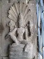 According to Hindu legend, Saraswati cursed the king of celestial deities, Indra, to become an elephant and roam around the place. He was relieved of the curse with the divine power of Vishnu, who appeared as the mount, Hastagiri. Hastagiri indicates a mount/hill in the form of elephant. Indra, the king of the devas, is believed to have installed the silver and golden lizards in the temple, who were the witness of the ordeal, after being released from the curse of the goddess Saraswati.[4] Brahma performed a yagna here, the site of which was about to be washed away by the fast flowing river Vegavati (Saraswati in the form of river), known today as the Palar River. The temple deity, Vishnu, laid himself flat to stay the flow and the yagna was successfully performed. Vishnu emerged with brilliance of thousand Suns as Varadharajaswamy inside the athi tree, and stayed here permanently until he was submerged in nearby tank since the deity came from yagna done by Brahma (Historically speaking, his placement may have been due to fear of invasion by the Delhi Sultanate).[4] As is the case with the association of South Indian temples with a sacred tree, a name of the temple, Attigiri, is derived from the atti tree (fig), considered sacred to Vaishnavas as well as other Hindus.[5] There is also stone deity found inside the temple is above the Narasimha shrine. The deity is called Devaraja Perumal, whose worship is equated to the Adi Athi Varadharaja Perumal, that is, two gods residing in one presiding idol.