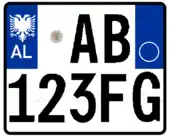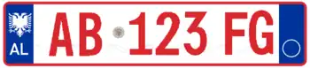 A new format similar to the post-1994 Italian and post-2009 French plate designs has been introduced since 16 February 2011.[1] The plates start with a blue strip at the left with 'AL' and redesigned double-headed eagle in white, 2 serial letters, security hologram, 3 digits, 2 serial letters on a rectangular white background, and end on the right with a blue strip that's supposed to show year of registration and regional code in white on. It has been observed that the last two identification elements are de facto not included while the font is more emphasized than the post-2002 one.[2] Plates of all vehicles would experience a similar change.[3] Critics claim that the color of the double headed eagle and strip is not representative of red and black colors of the Albanian flag.