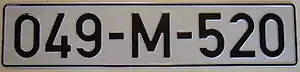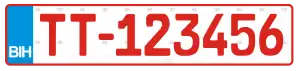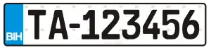 Bosnia and Herzegovina vehicle registration plates have held their current form since 2 February 1998.[1] Currently the Bosnia and Herzegovina (BiH) vehicle registration plate format consists of seven characters: five numbers and two letters arranged in the following order: X00-X-000 (taxis: TA-000000). The plates are uniform across the country and do not denote the place (town, municipality, canton, or entity) where the vehicle is registered, as was the case prior to 1998. Likewise the plates do not contain any heraldic symbols. The plates use only letters which are represented equally in Latin and Cyrillic script (A, E, O, J, K, M, T).