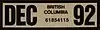 1944 | Embossed cream serial on black plate with border line; "BRITISH COLUMBIA" at bottom and vertical "44" at right | none | 12-345 | 1 to 99-999 | |