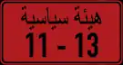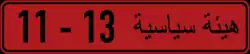 Diplomatic and consular license plates are black on red, and follow the format [1 to 99 - NN هيئة سياسية]. This type of plate does not have "ليبيا" (Libya) written on it, but instead, "هيئة سياسية", in Ruqʿah script. This means "Political Corps". The format of this license plate consists of a 1 or 2 digit number, separated by a dash from a 2 or 3 digit code indicating the country of the owner of the vehicle (NN). This code is identical to that used for Foreigner-owned private vehicles.