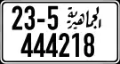License plates in this era had an identical colour composition as the current series, black on white for private vehicles, black on red for diplomatic vehicles, and black on yellow for other types of vehicles. Instead of ليبيا (Libya), these license plates carried the term الجماهيرية (Al-Jamahiriya) either on the right hand side or the right top corner in Ruqʿah script. Jamahiriyais an Arabic term generally translated roughly to "peopledom" or "state of the masses". This term was used, as Libya's official name under Gaddafi was Libyan Arab Jamahiriya .