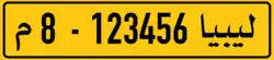 Libya requires its residents to register their motor vehicles and display vehicle registration plates.[1] Current plates are European standard 520 mm × 110 mm.