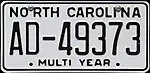 Multi-Year Trailer | 1993–present | Embossed black on white with border line; "NORTH CAROLINA" at top; "MULTI YEAR" at bottom | AB-12345 DB-12345 |