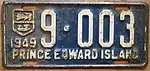 1949 | Embossed white serial on blue plate with border line; "PRINCE EDWARD ISLAND" at bottom; provincial shield and "1949" at left | none | 1-234 | 1-001 to approximately 9-999 | |