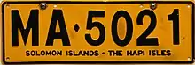 The Solomon Islands requires its residents to register their motor vehicles and display vehicle registration plates. Until 2014 motorists usually made their own plates, but since 2014 the Solomon Islands Government have issued them.[1] Current plates are Australian standard 372 mm × 134 mm.[2]