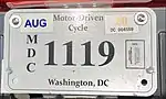 The U.S. federal district of Washington, D.C., first required its residents to register their motor vehicles in 1903. Registrants provided their own license plates for display until 1907, when the district began to issue plates.[1] Plates are issued by the District of Columbia Department of Motor Vehicles (DC DMV). Front and rear plates are required for most classes of vehicles, while only rear plates are required for motorcycles and trailers.