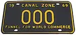 The former U.S. territory of the Canal Zone first issued license plates in 1910, and this continued until the Canal Zone was returned to Panama in 1979.[1] A single plate was issued for all years. The country of Panama also issued Canal Zone license plates for United States citizens that lived in Panama but worked in the Canal Zone, but these plates have the country name "Panama" clearly showing on them.[2] Since reciprocity for license plates between the Canal Zone and Panama did not exist until 1950, old photos often show local vehicles with two different license plates mounted on the vehicle.[3]