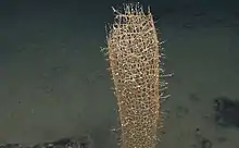 The Venus' flower basket (Euplectella aspergillum) is a glass sponge in the phylum Porifera. It is a marine sponge found in the deep waters of the Pacific ocean, usually at depths below 500 m (1,600 ft). Like other sponges, they feed by filtering sea water to capture plankton and marine snow.[1] Similar to other glass sponges, they build their skeletons out of silica, which forms a unique lattice structure of spicules. The sponges are usually between 10 cm (3.9 in) and 30 cm (12 in) tall, and their bodies act as refuge for their mutualist shrimp partners. This body structure is of great interest in materials science as the optical[2] and mechanical[3] properties are in some ways superior to man-made materials. Little is known regarding their reproduction habits, however fluid dynamics of their body structure likely influence reproduction and it is hypothesized that they may be hermaphroditic.[4]
